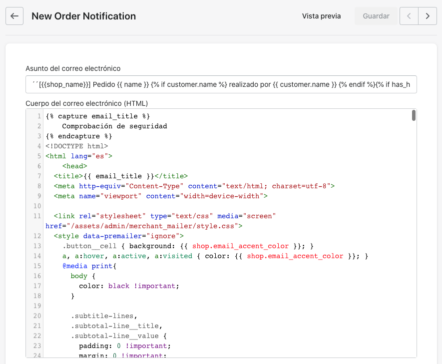 Lo que tendrás que hacer es modificar la plantilla de la notificación para Pedidos nuevos, para esto deberás ir, dentro de tu dashboard de Shopify a Configuración > Notificaciones y muy abajo de la misma verás una opción que dice Plantillas > Pedidos nuevos (OJO, el texto puede variar un poco) te anexo una imagen para mejor referencia: