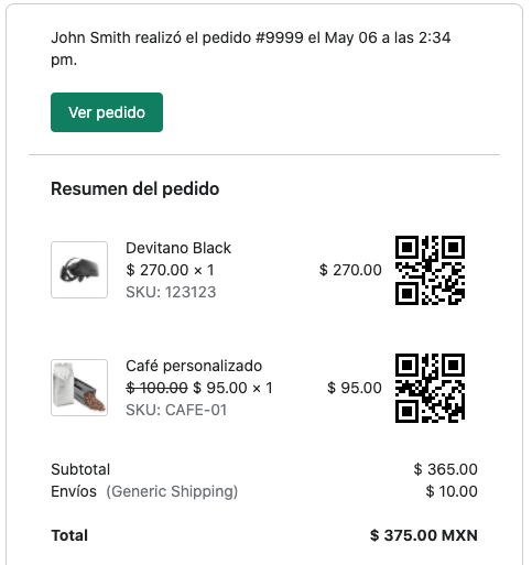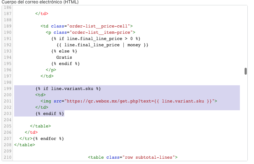 Si quisieras saber que otras opciones de información puedes usar para generar el código QR puedes revisar la siguiente referencia de Shopify, que como siempre pasa con ellos, es muy completa: https://help.shopify.com/es/manual/orders/notifications/email-variables#propiedades-de-la-l-nea-de-art-culo