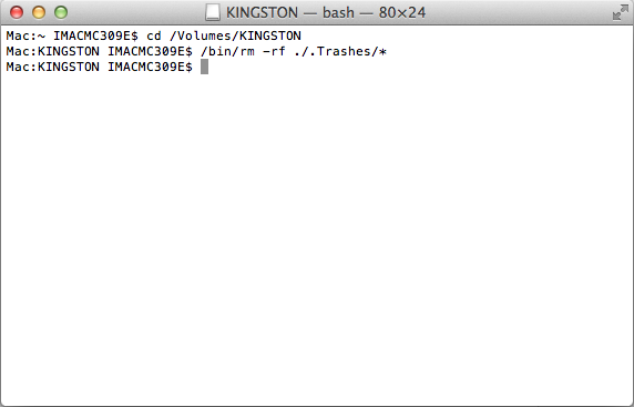Con esto entraremos en la ruta de la memoria, lo siguiente será eliminar los archivos "borrados" escribiendo lo siguiente /bin/rm -rf ./.Trashes/* con lo que se eliminarán definitivamente de la memoria todos los archivos dentro de la carpeta .Trashes.