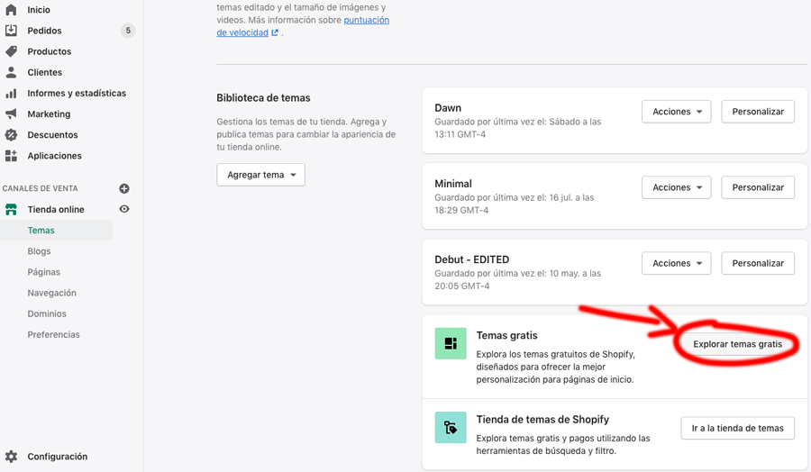 Lo siguiente sería instalar Dawn, para eso, dentro de Tienda online, en la sección de Biblioteca de temas buscamos la opción que dice Explorar temas gratis