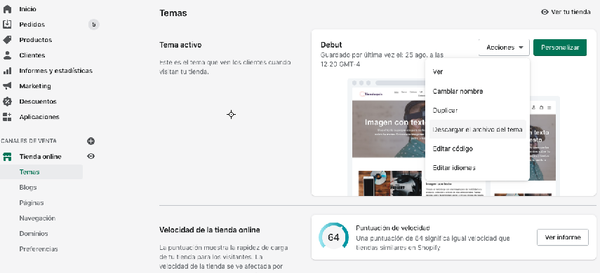Primero haremos un respaldo del tema actual, para eso, dentro de tu administrador de Shopify debes dirigirte a Tienda online, dentro de la sección Tema activo hacemos click en Acciones y Descargar el archivo del tema, esto te generará un archivo ZIP con todo el código del tema, este te llegará por email, por lo que debes estar seguro de que esté configurado el correcto