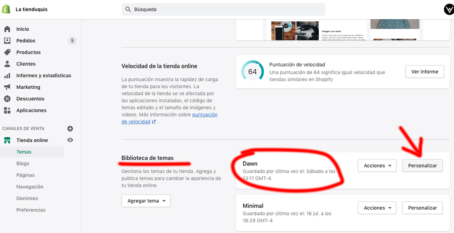 Una vez completado el nuevo tema este aparecerá en la sección de Biblioteca de temas y desde ahí mismo es que puedes hacer las configuraciones necesarias sin afectar el tema activo actualmente y una vez terminada la configuración, simplemente regresas a Biblioteca de temas y en Dawn das click en Acciones y Publicar.
