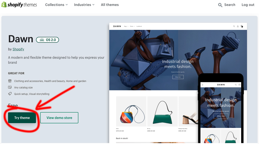 Esto nos abrirá la tienda de temas de Shopify directamente en la sección de temas gratuitos, donde el primero que veremos será Dawn, damos click en el y se nos abrirá la página de información del tema, puedes checar las características del mismo, y para instalarlo da click donde dice Try theme, esto comenzará con la instalación
