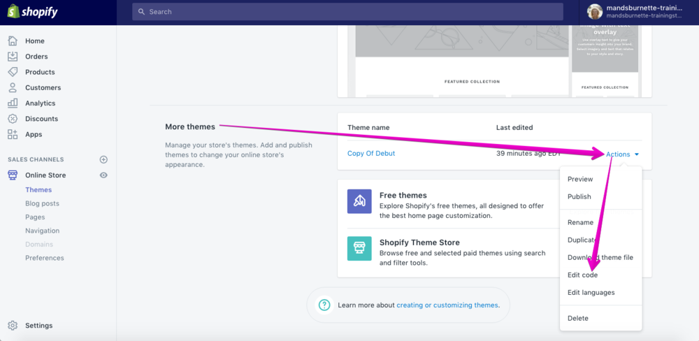 Para trabajar con el código de Shopify desde su propio dashboard es muy fácil, debemos seleccionar el tema que deseamos modificar y hacer click en Edit code, como se indica en la siguiente imagen: